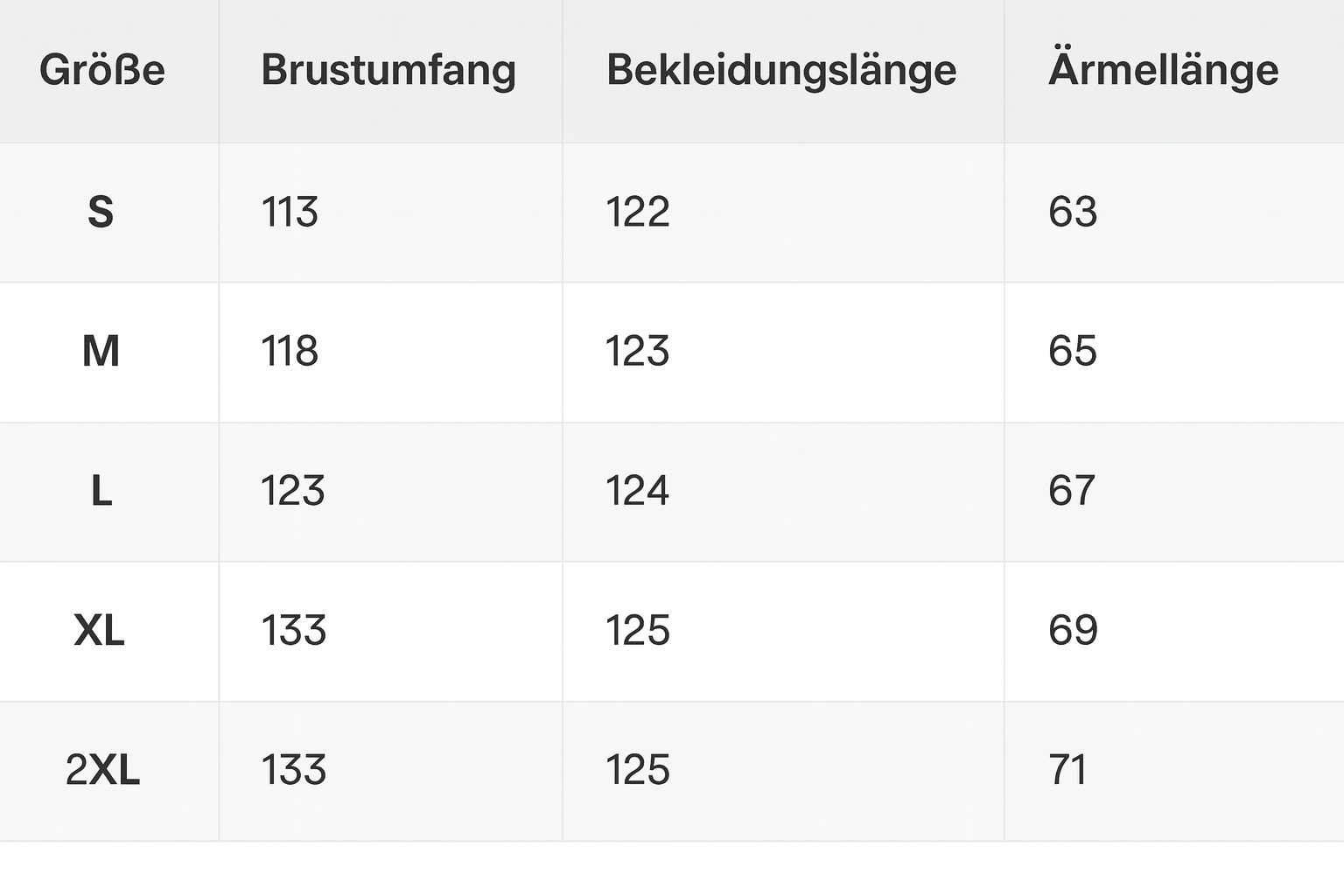 Größentabelle: